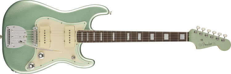 Fender Parallel Universe Vol II Jazz Strat to połączenie smukłego, konturowanego korpusu Stratocastera z gryfem, systemem vibrato i przetwornikami Jazzmastera. Wykończony w kolorze Mystic Surf Green, Jazz Strat charakteryzuje się również dopasowaną kolorystycznie główką, aluminiowymi gałkami potencjometrów (Vintage-Style Radio) oraz customowym pickguardem wykonanym przez kalifornijską markę Decoboom. Pickguard Streamline w barwie kości słoniowej z podwójnym paskiem w kolorze Surf Green prezentuje się bardzo elegancko, podkreślając unikalny design instrumentu.