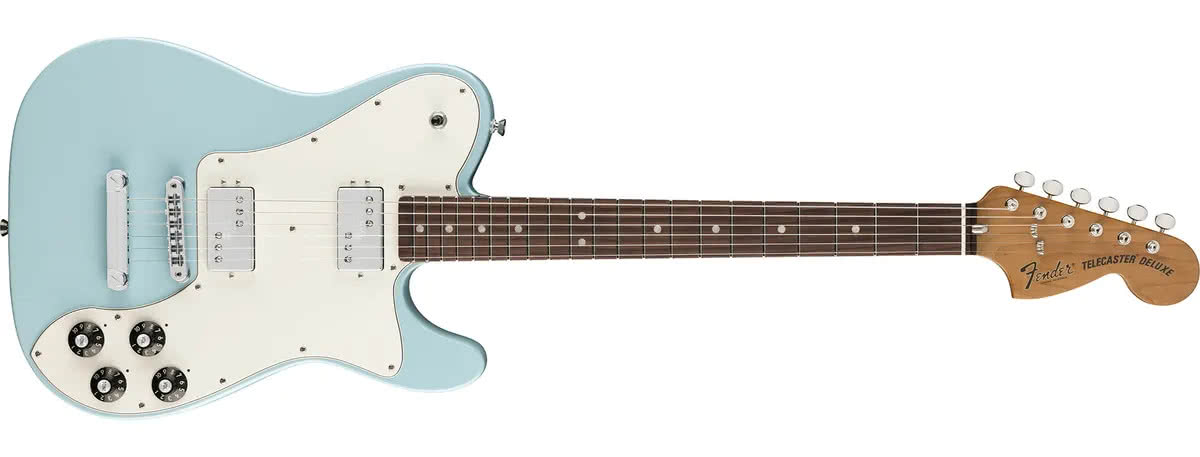 Delta Day Telecaster Deluxe wyróżnia się przede wszystkim nowym, jasnym wykończeniem Daphne Blue, które zastępuje wcześniejszą wersję „Mississippi Midnight”. Ten subtelny kolor podkreśla elegancję instrumentu i doskonale kontrastuje z białym pickguardem, nadając gitarze świeży, nowoczesny wygląd.