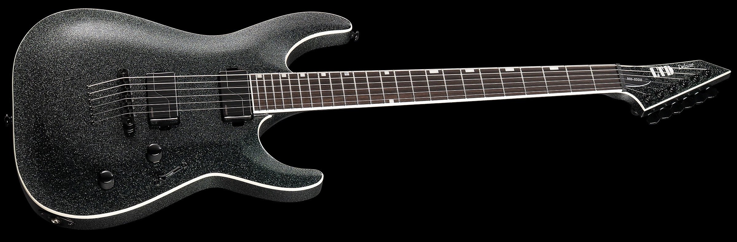 Instrument wyposażono także w solidne elementy hardware: blokowany mostek TonePros Tune-O-Matic z tailpiece’em, blokowane klucze tuners LTD, oraz czarny wykończenie osprzętu, które kontrastuje z błyszczącym, Granite Sparkle lakierem i eleganckim boundingiem korpusu i główki.