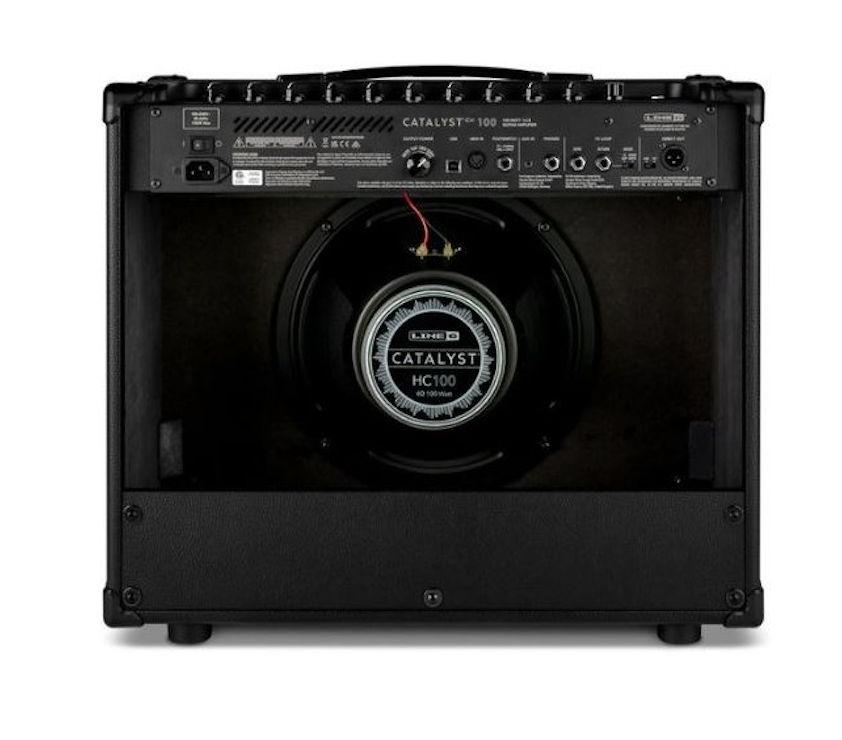 Tylny panel wzmacniacza to również przełącznik mocy (Mute / 0,5 W / 50 W / 100 W), port USB-B, wejście MIDI DIN, gniazdo footswitcha, wejście AUX 1/8”, wyjście słuchawkowe 1/4”, pętlę efektów z przełącznikiem trybu (Loop / Power Amp In) oraz wyjście XLR DI z przełącznikiem Ground Lift. W trybie Power Amp In wzmacniacz może działać jako aktywna kolumna – np. dla zewnętrznego procesora dźwięku. Port USB pozwala używać Catalysta jako interfejsu audio, wysyłając 24-bitowy sygnał (44,1 lub 48 kHz) do DAW i odsłuchując przez kolumnę lub słuchawki.