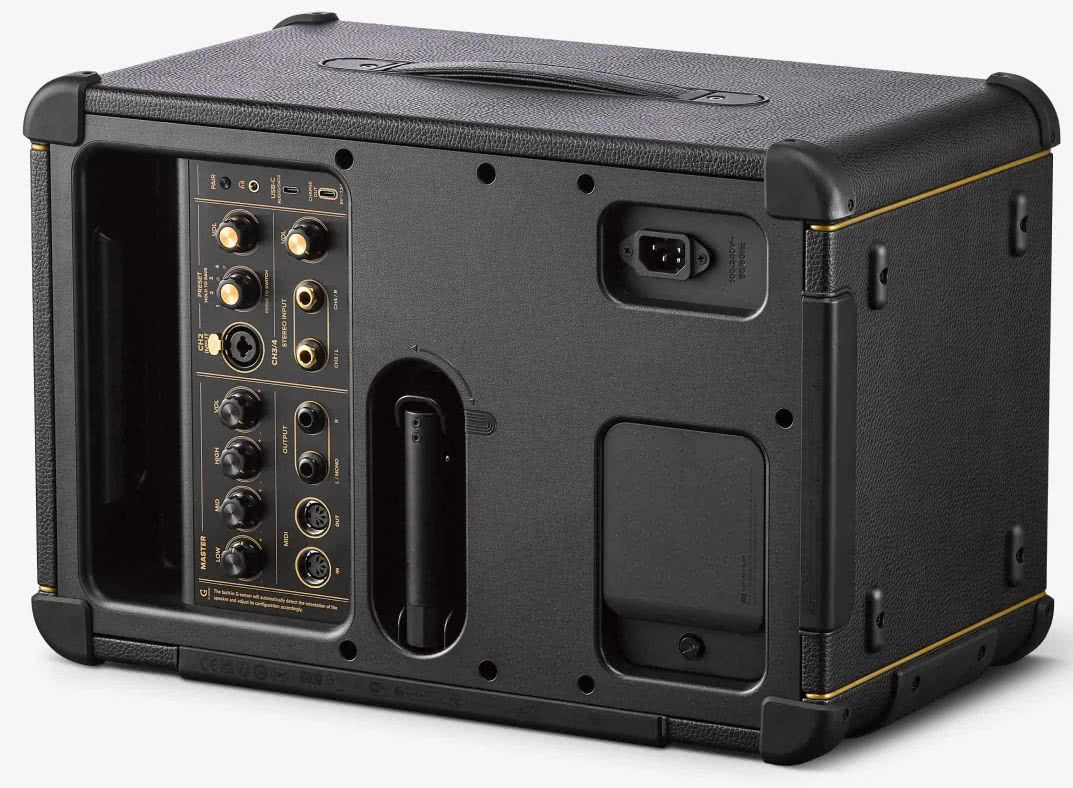 Z tyłu znajdziemy resztę wejść i wyjść. Kanał 2 przeznaczony jest dla gitary akustycznej, basu lub wokalu – posiada wejście combo ¼”/XLR, regulację głośności i osobny selektor ośmiu presetów z trzema modelami wzmacniaczy (vocal, bass, acoustic) i 50 efektami. Kanały 3 i 4 (stereo) obsługują klawisze, automat perkusyjny lub inne źródła liniowe, każdy z własną regulacją głośności. Sekcja Master obejmuje globalne EQ (High, Mid, Low) i Volume.